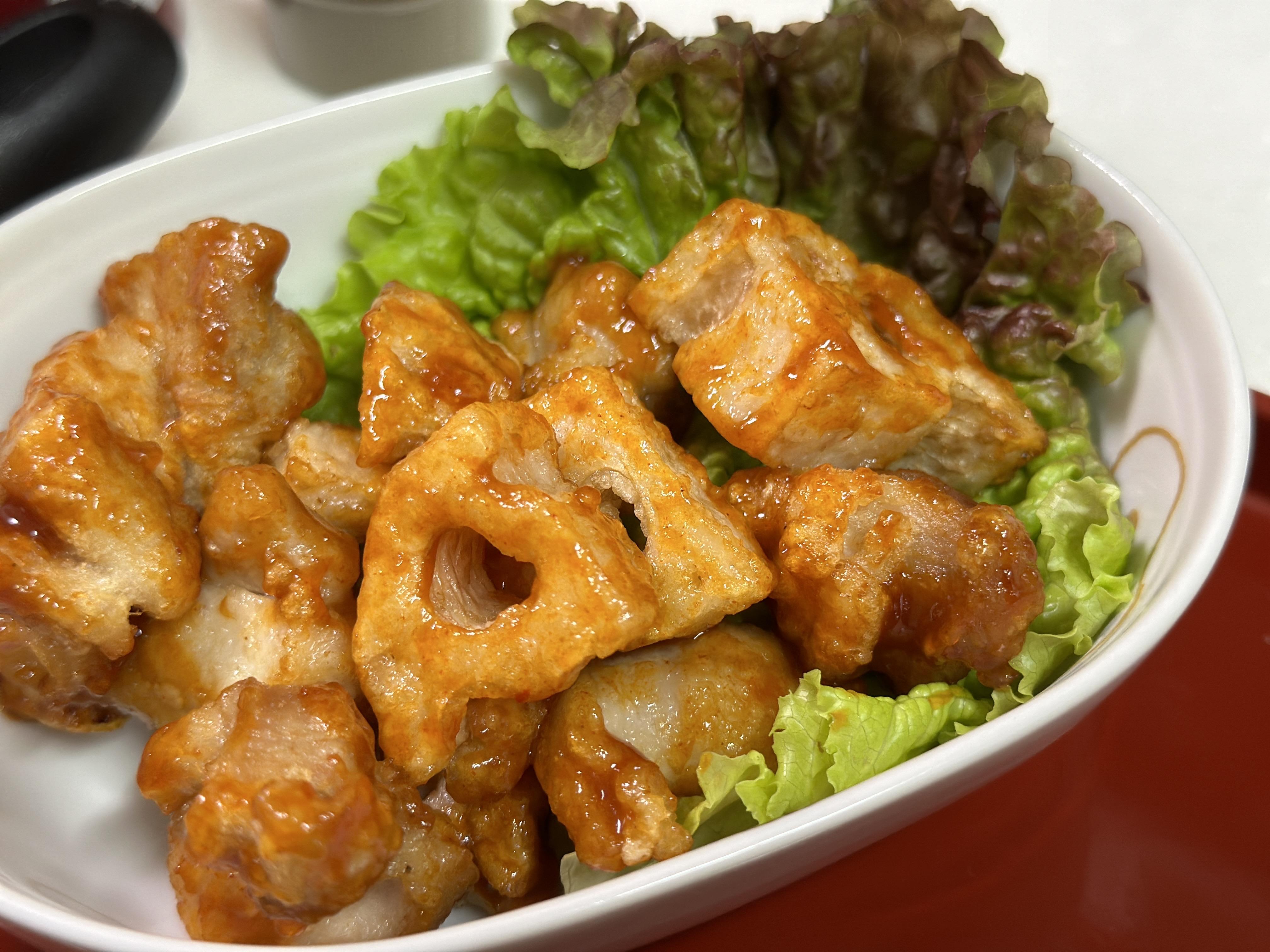 ④ Aの<甘酢醤油タレ>を鍋に入れ、弱火にかけ軽く煮立ったら火を止め、③の素揚げれんこんをタレにからめる。