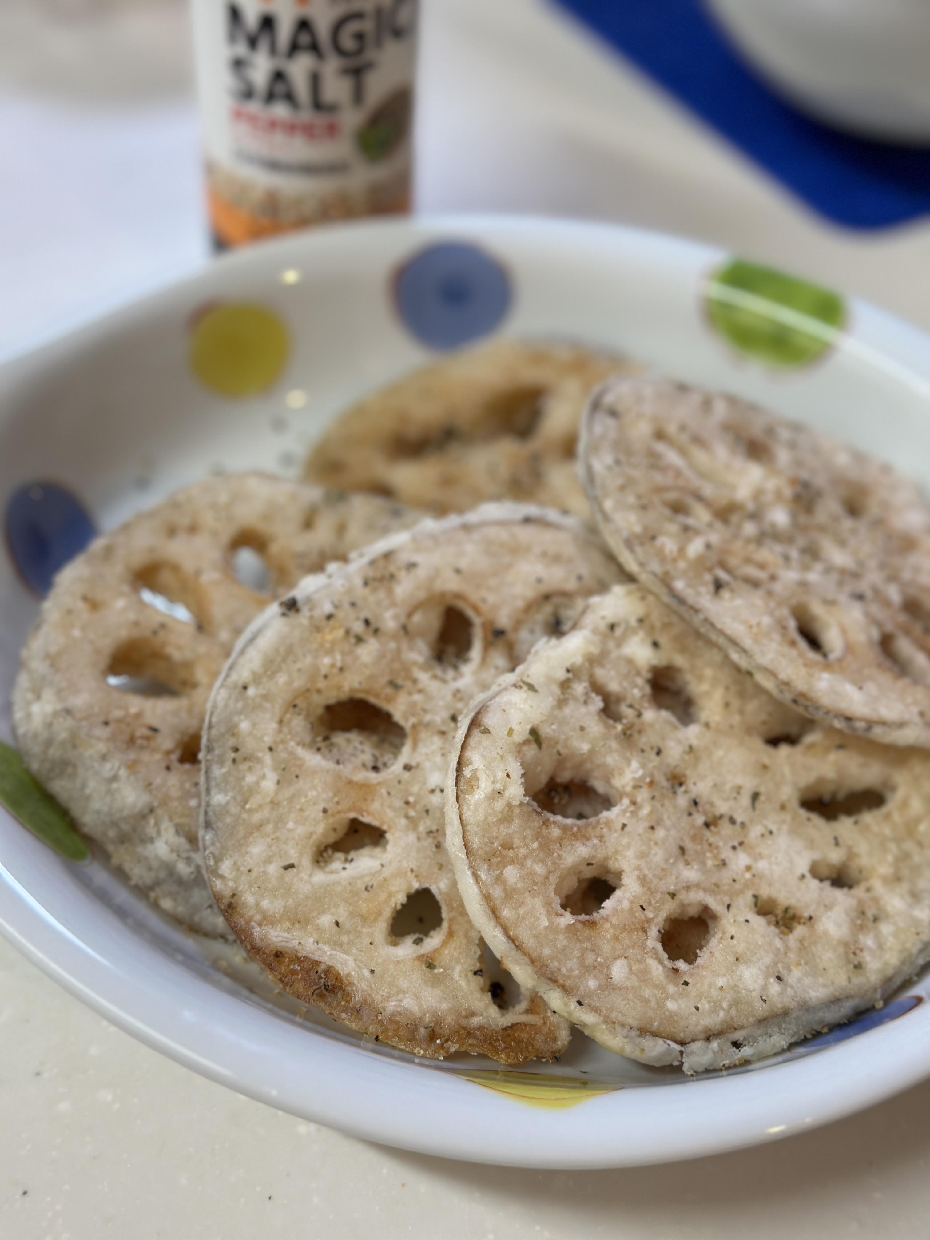 ④ 揚げ油を170℃程度に熱し、れんこんをそっと入れて、両面にこんがりきつね色になるまで揚げる。油をきって器に盛り、好みで練りがらしや酢じょうゆを添えてどうぞ。