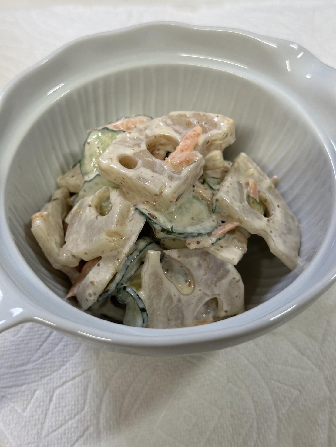 ④ ボールに調味料を混ぜておき、れんこん、にんじんはしっかり水を切って、和えれば出来上がり。