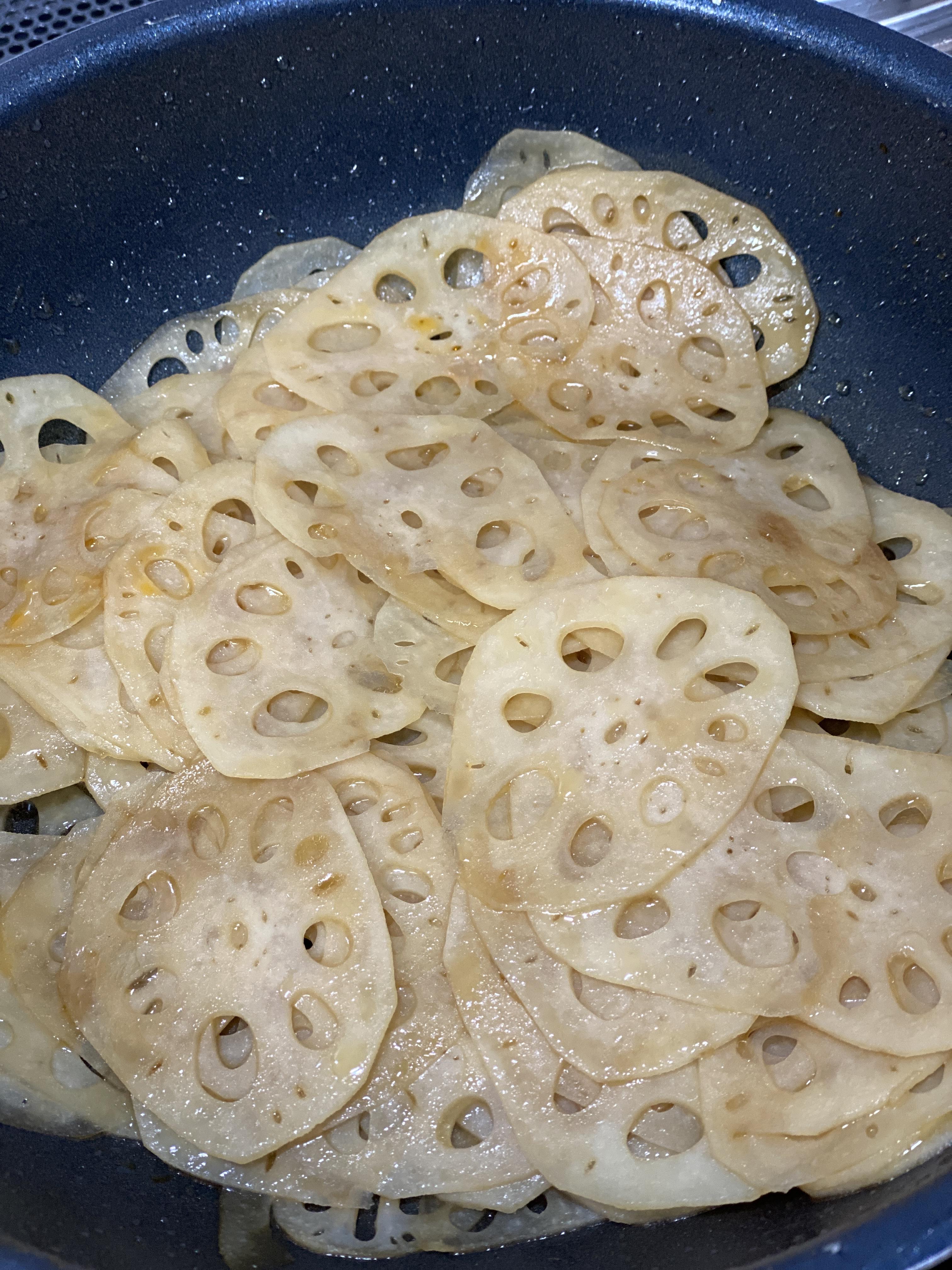 ③ フライパンにごま油を熱し、水気をよく切ったれんこんを加えて、木じゃくしで混ぜながら、透き通るようになるまでじっくり炒める。
