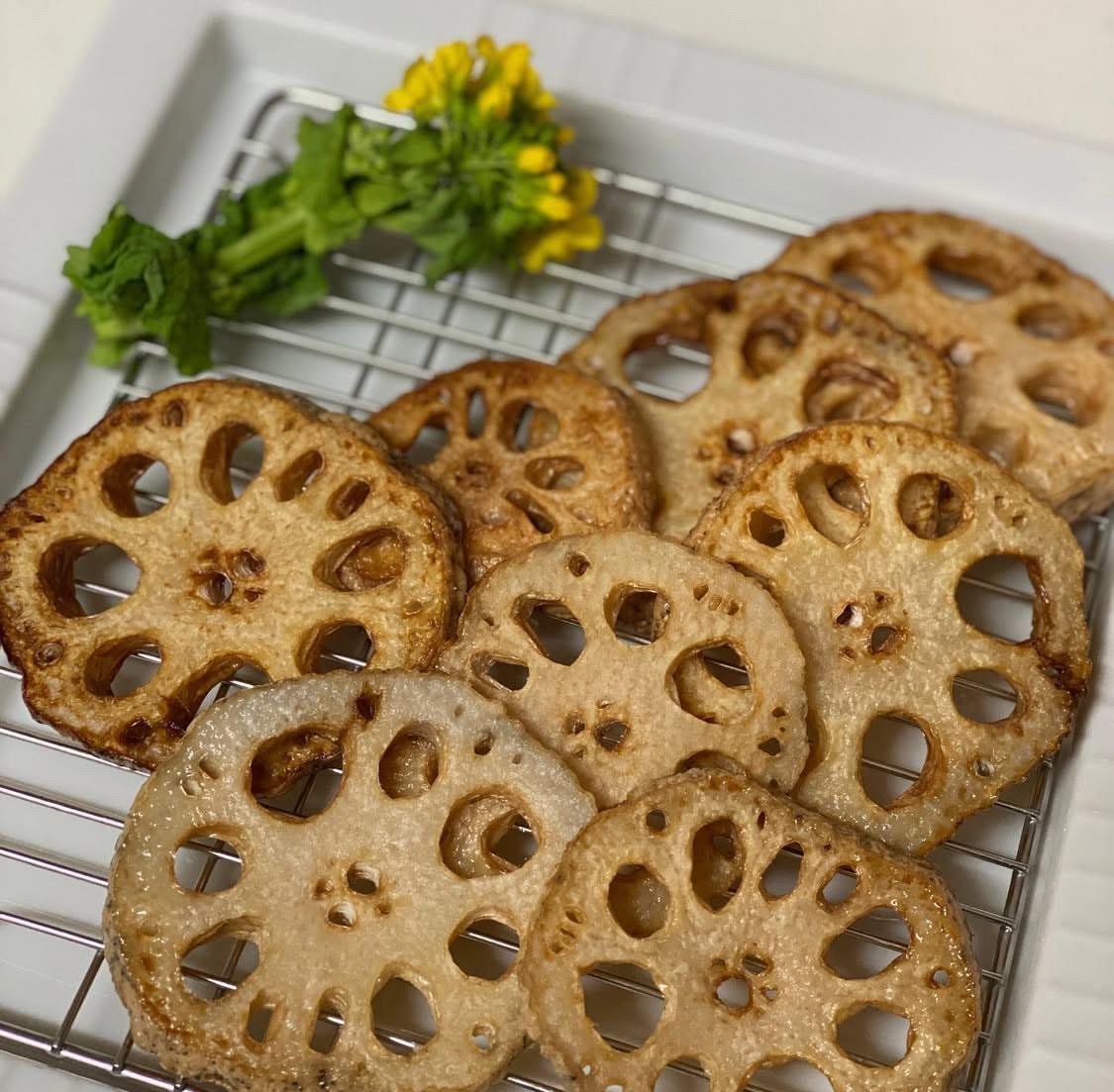 ① れんこんは皮付きのまま(あるいはお好みでむいても)薄めにスライスし、水にサッとさらしてアクを抜く。