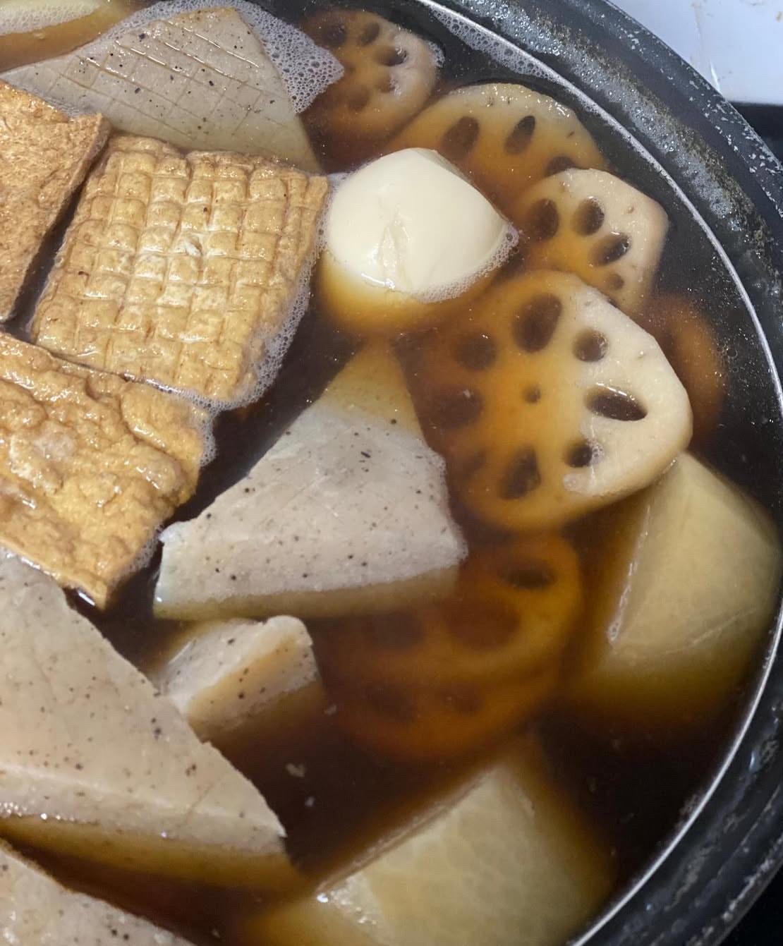 大根、れんこん、こんにゃく、厚揚げ、ゆで卵を加え、弱火でじっくり30〜40分ほど煮込む。